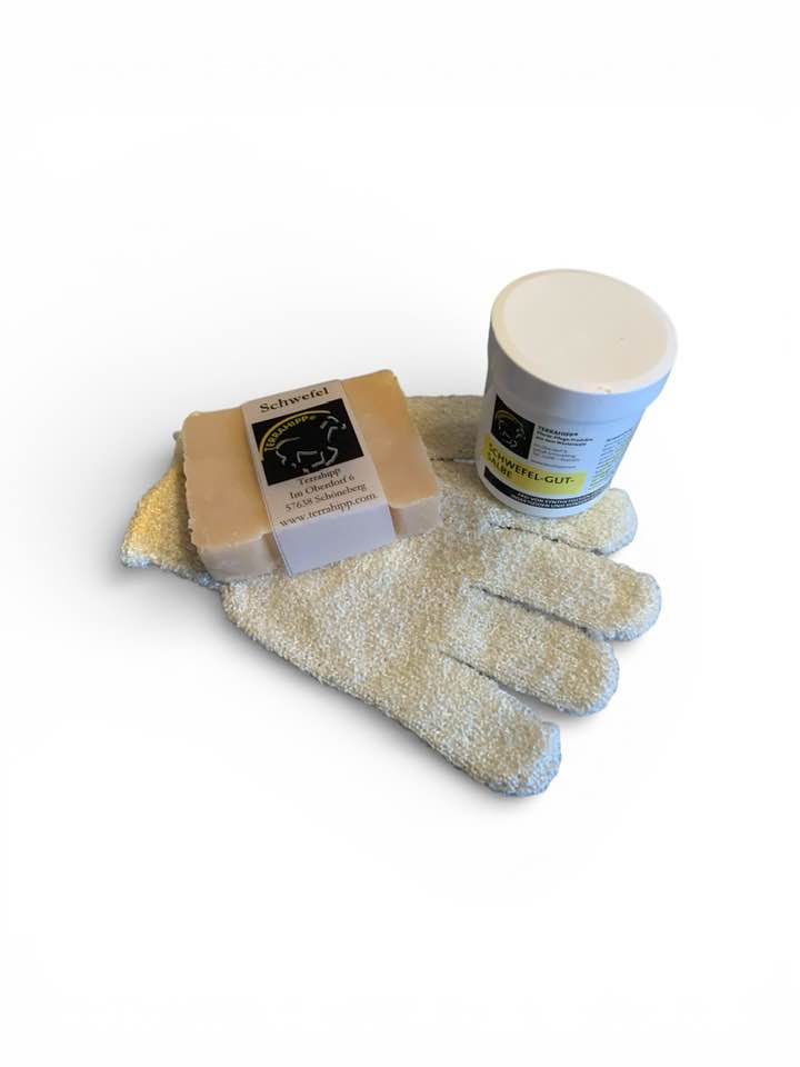 Anwendung: Bitte als erstes die geschädigten Partien mit der Schwefelseife waschen und einmassieren (mit dem mitgelieferten Waschhandschuh) und ca. 10min einwirken lassen, danach ausspülen und mit einem Handtuch vorsichtig trocken reiben. Danach die Schwefel-Gut Salbe auftragen. Vorgang mehrfach die Woche wiederholen, bis sich die Situation beruhigt hat.