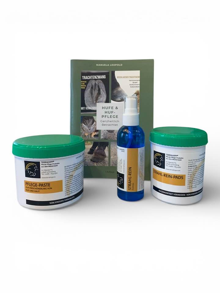 Strahl-Rein Power Set besteht aus einer Pflegepaste 500g und Strahl-Rein-Pads, 40Stück, 100ml Strahl-Rein flüssig, zwei Pinseln, Pads und dem Ratgeber Hufe und Hufpflege – ganzheitlich betrachtet.