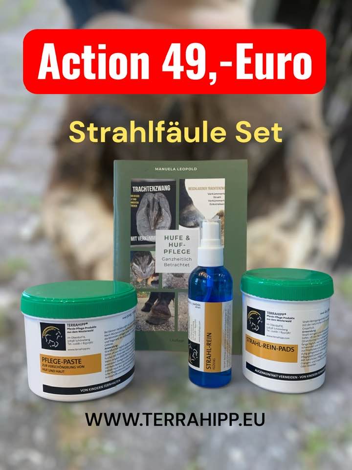 Anwendung: Abwechselnd anwenden. Starte mit den Strahl-Rein-Pads und tamponiere diese in die tiefliegende, geöffnete Strahlfurche ein, so dass du sie einfach wieder entfernen kannst. Am darauffolgenden Tag nutze die mitgelieferten Pads und streiche die Pflegepaste auf das Pad und tamponiere diese in die geöffnete Strahlfurche ein, bitte so, dass du das Pad am nächsten Tag wieder herausziehen kannst. Das Strahl-Rein flüssig zum Sprühen kannst du an den Hufen nutzen, die noch nicht so sehr mit Fäulnis befallen sind. Auch die Paste kann auf die komplette Sohle aufgetragen werden. Das verhindert die Neubildung von Bakterien und macht die Sohle tragfähig.